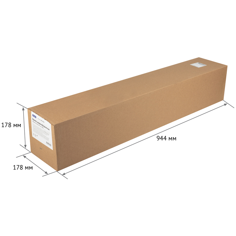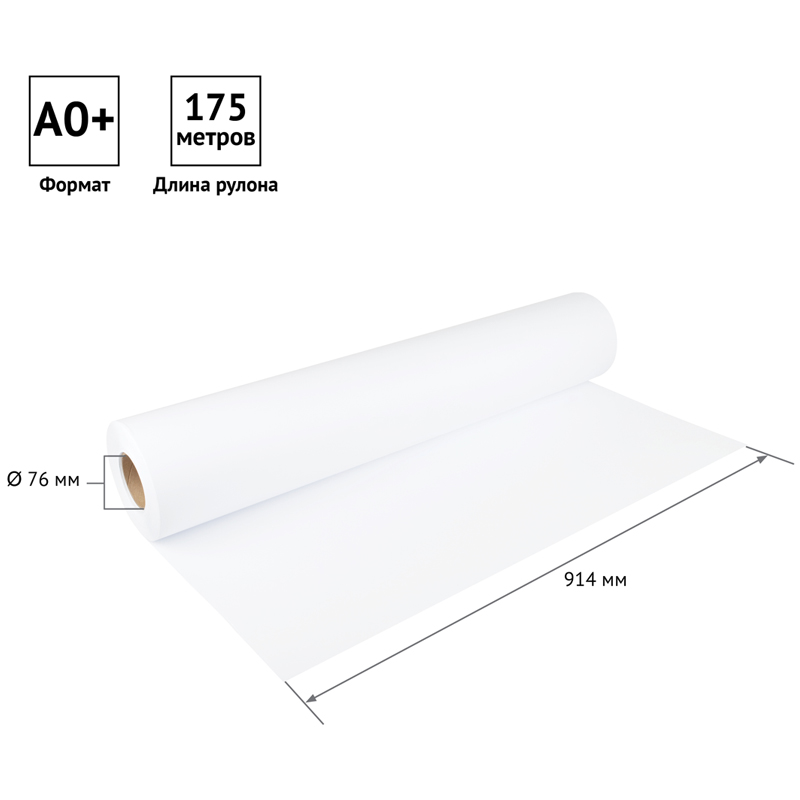 Размер бумажного полотна составляет 914 мм, что соответствует формату А0+. Длина рулона - 175 м. Внутренний диаметр втулки - 76 мм. Плотность бумаги 80 г/м², белизна по CIE 146%. Для защиты от влаги и поддержания нормального уровня влажности рулон упакован в полиэтиленовую пленку, на торцах рулона имеются заглушки. Размеры короба - 94,4×17,8×17,8 см