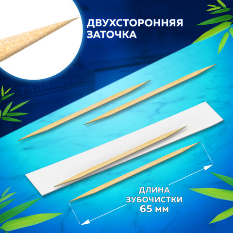 Прочные бамбуковые зубочистки БЕЛЫЙ АИСТ в индивидуальной бумажной упаковке являются отличным выбором для заведений общественного питания. Предназначены для поддержания гигиены полости рта после приема пищи. Бамбуковые зубочистки имеют двухстороннюю заточку, не слоятся и не ломаются, что делает их безопасными для зубной эмали. Зубочистки не содержат красителей и вредных пропиток. Прекрасно подходят дня приготовления канапе из фруктов, овощей, сыра, морепродуктов и мясных изделий. В картонной упаковке содержится 1000 зубочисток длиной 65 мм.