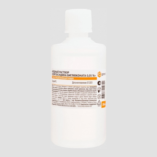 Водный раствор хлоргексидина биглюконата 0,05%. Форма выпуска - раствор для местного и наружного применения. Дезинфицирующее средство 'Водный раствор хлоргексидина биглюконата 0.05%' представляет собой готовое к применению средство в виде бесцветной прозрачной или слегка опалесцирующей жидкости без запаха или со слабым запахом. Состав действующее вещество: хлоргексидина биглюконат - 0,05%; вспомогательное вещество: вода очищенная. Средство проявляет бактерицидное в отношении грамположительных и грамотрицательных бактерий (в том числе в отношении возбудителей внутрибольничных инфекций), туберкулоцидное, вирулицидное (острые респираторные вирусные инфекции, герпес, полиомиелита, гепатиты всех видов, включая гепатиты А, В, и С, ВИЧ-инфекция, аденовирус и др.) и фунгицидное (в отношении грибов родов Кандида и трихофитон) действие. Средство предназначено для применения в лечебно-профилактических учреждениях: - для гигиенической обработки рук медицинского персонала, в том числе персонала машин скорой медицинской помощи; - для обеззараживания и обезжиривания кожи инъекционного поля; - для санитарной обработки кожных покровов и кожи ступней ног с целью профилактики грибковых заболеваний; - для обеззараживания надетых на руки персонала резиновых перчаток (из материалов, устойчивых к химическим веществам) во время оперативных вмешательств и манипуляций, требующих хирургической антисептики, при работе с потенциально инфицированным материалом (микробиологические лаборатории); - при сборе медицинских отходов классов Б и В (СанПиН 2.1.7.728-99 'Правила сбора, хранения и удаления отходов в лечебно-профилактических учреждениях'; СП 1.3.2322-08 'Безопасность работы с микроорганизмами III-IV групп патогенности (опасности) и возбудителями паразитарных болезней'); - при проведении массовой иммунизации (СП 3.3.2342-08 "Обеспечение безопасности иммунизации"); - для дезинфекции мелкого инструментария простой конфигурации; - как профилактическое средство в виде орошений, полосканий и аппликаций на пораженную поверхность кожи или слизистых оболочек; - для гигиенической обработки рук учащихся общеобразовательных учреждений, персонала детских дошкольных и школьных учреждений, учреждений соцобеспечения (дома претарелых, хосписы и т.п.), работников парфюмернокосметических предприятий (в том числе парикмахерских, косметических салонов и т.п.), общественного питания, коммунальных объектов, предприятий пищевой и химико-фармацевтической промышленности; - для гигиенической обработки рук, кожи инъекционного поля, санитарной обработки кожных покровов и кожи ступней ног с целью профилактики грибковых заболеваний, как профилактическое средство населением в быту. Способ применения: Гигиеническая обработка рук: 3 мл средства наносят на кисти рук и втирают в кожу до высыхания в течение 30 секунд. Обработка инъекционного поля, в т.ч. в месте прививки: - кожу протирают стерильным ватным тампоном, обильно смоченным средством; время выдержки после окончания обработки - 30 сек; - проводят способом орошения кожи в месте инъекции до полного увлажнения с последующей выдержкой после орошения 30 сек. Профилактическая обработка ступней ног, санитарная обработка кожных покровов: обильно смочить ватный тампон (не менее З мл на каждый тампон) и тщательно обработать каждую ступню ног 