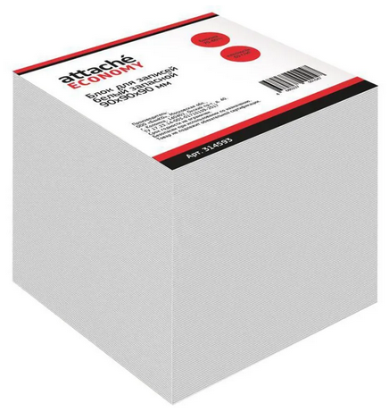 Блок для записей Attache Economy высотой 9 см сложен из квадратных листов размером 9×9 см. Листы не склеены между собой. В блоке находится 900 листов +/- 5%. Листы изготовлены из бумаги эконом класса плотностью 65 г/кв.м и белизной 70-80%. Цвет бумаги — оттенок белого, близкий к светло-серому. Блок для записей подходит для письма любыми типами ручек и карандашей. Для повышения удобства рекомендуется использование в пластиковых подставках и настольных органайзерах. Поставляется в термоусадочной пленке, защищающей блок при транспортировке.