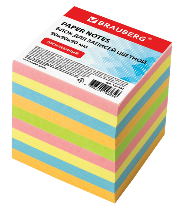 Блок для записей BRAUBERG проклеенный, куб 9х9х9 см, цветной, 129207