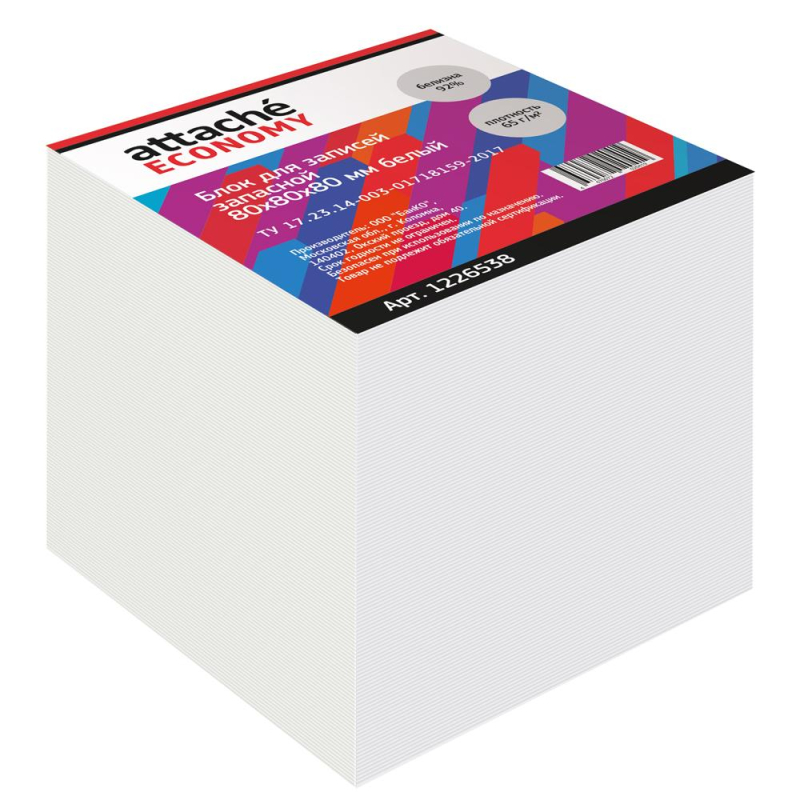 Блок для записей Attache Economy предназначен для работы в офисе или дома. Будет полезен в использовании для рабочих процессов и повседневных задач. Отлично подходит для работников офиса.Блок высотой 8 см сложен из квадратных листов размером 8 х 8 см. Листы не склеены между собой. Листы изготовлены из белой офсетной бумаги плотностью 65 г/м2 и белизной 92%. Блок для записей подходит для письма любыми типами ручек и карандашей. Поставляется в термоусадочной пленке, защищающей блок при транспортировке. Для повышения удобства рекомендуется использование в пластиковых подставках и настольных органайзерах.