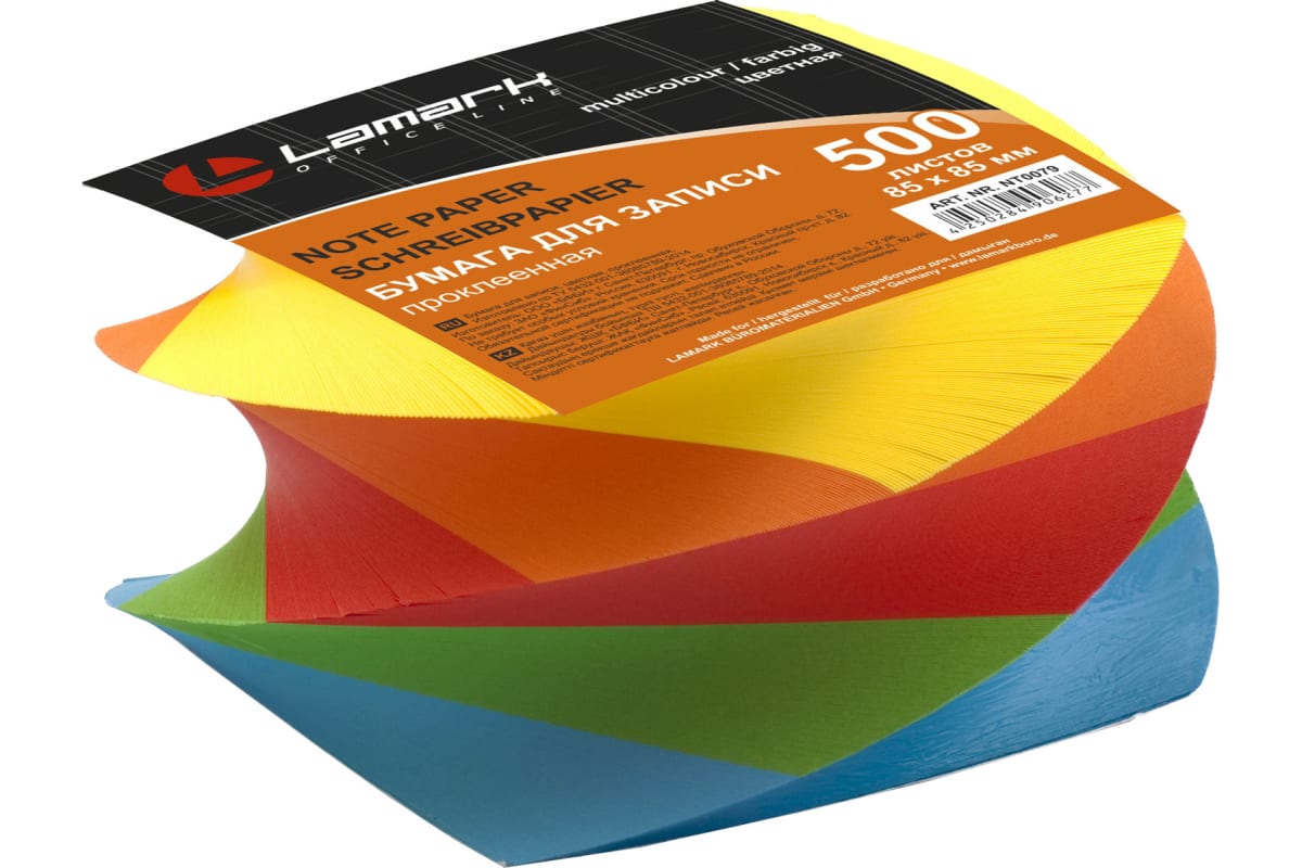Бумага для записи Lamark цветная, проклеенная, куб-спираль. Размер листа 85х85 мм, 500 листов, плотность 80 г/м2, пять интенсивных цветов, в термопленке.