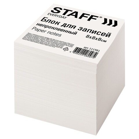 Блок для записей STAFF непроклеенный, куб 8х8х8 см, белый, белизна 70-80%, 111981