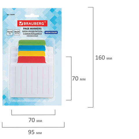 Блок-разделитель самоклеящийся (стикеры) BRAUBERG, ЛИНОВАННЫЙ, 70х70 мм, 4 цвета х 25 листов, ассорти, 126695