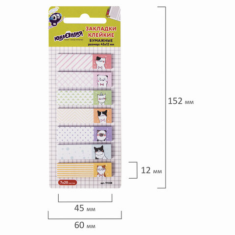 В наборе по 20 закладок каждого из 7 дизайнов. Размер закладки: 45х12 мм. Клейкий слой - 32 Н/м. Материал закладок позволяет делать на них надписи ручкой или карандашом. Поставляются в полиэтиленовом пакете с европодвесом.