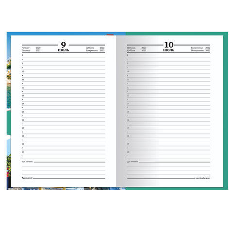 Внутренний блок содержит 192 листа офсетной бумаги плотностью 60 г/м2. Обложка 7БЦ (твердый переплет с рисунком и глянцевой пленкой) обеспечивают долгий срок службы. Помимо прочего ежедневник содержит коды городов и телефонную книгу. Формат А5.