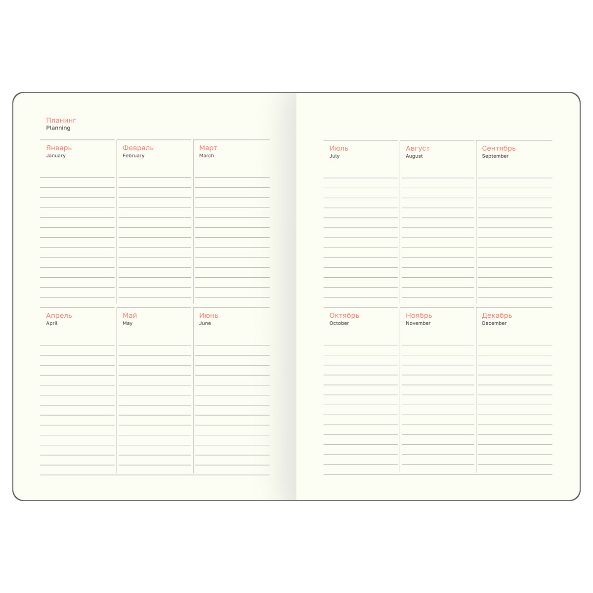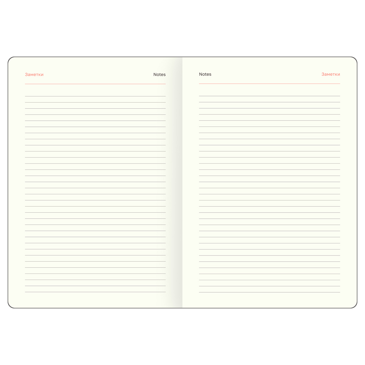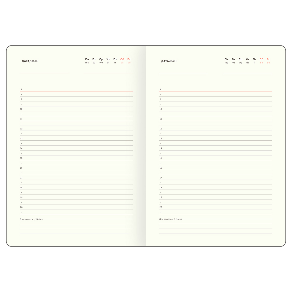 Формат – А5 (145*205 мм). Изделие состоит из 136 листов тонированной бумаги плотностью 70 г/м2, которая подходит для любых типов ручек и не будет просвечиваться. В линованный блок с полем для даты удобно записывать встречи, идеи и задачи.