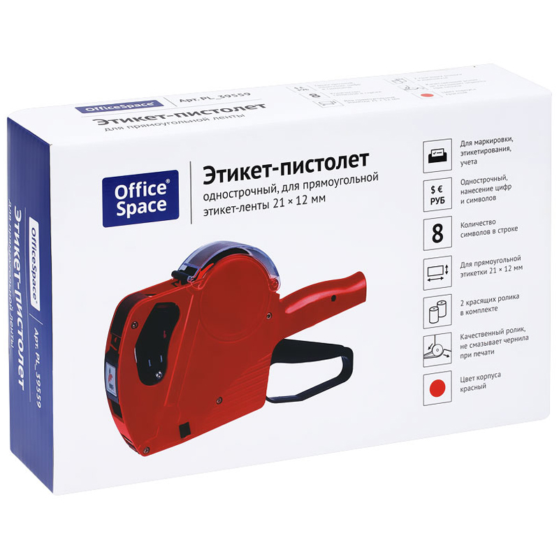 Однострочный этикет-пистолет OfficeSpace – качественный ручной инструмент для маркировки этикеток, с помощью которого вы можете нанести необходимую информацию в виде цифр и символов на нужный товар. 8 символов в строке. Тип ленты – прямоугольная, размер этикет-ленты – 21*12. Размер втулки – 30 мм. В комплекте 2 красящих ролика, этикет-лента, этикет-пистолет и инструкция. Пистолет изготовлен из высококачественного пластика и снабжен красящим роликом высокого качества, не смазывающим чернила при печати. Упакован в картонную коробку.