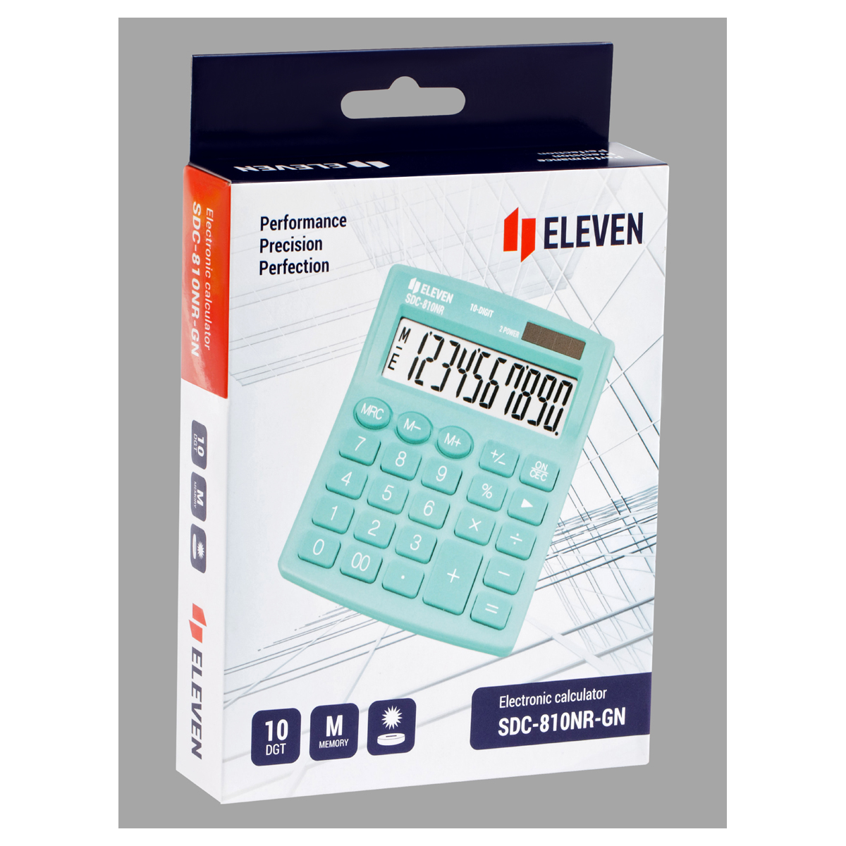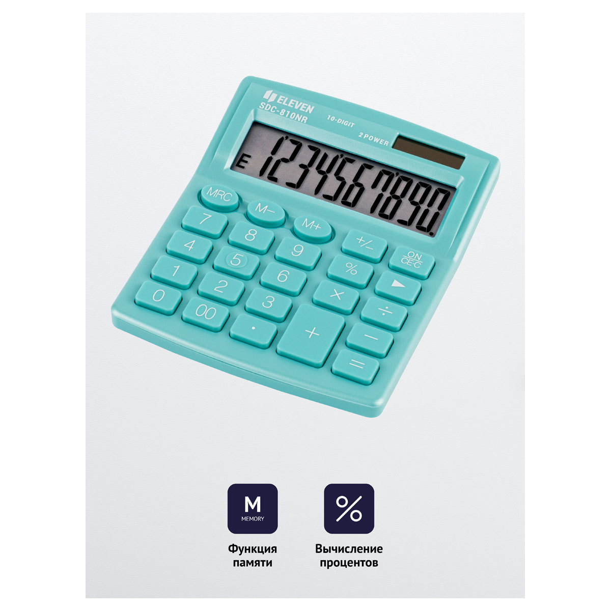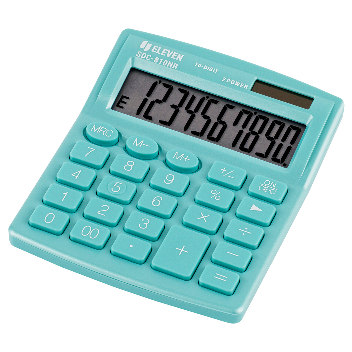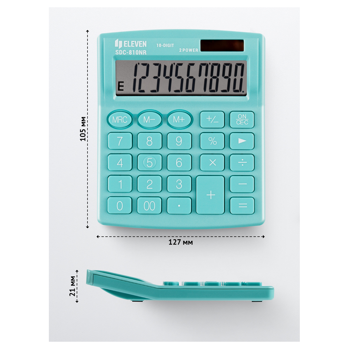 10-ти разрядный настольный калькулятор Eleven SDC-810NR-GN предназначен для выполнения арифметических операций. Оптимальный набор функций поможет автоматизировать расчёты: функция смены знака, коррекция последнего введенного значения. Двойное питание (солнечная батарея + батарея GP189(LR54)) и автоматическое отключение увеличивают срок службы. Размер калькулятора – 102*124*25 мм, вес – 94 г, цвет – бирюзовый. Упакован в картонную коробку. Гарантия 5 лет. • Разрядность: 10; • Тип питания – двойное (солнечная батарея/батарейка GP189(LR54)); • Клавиша «00»;