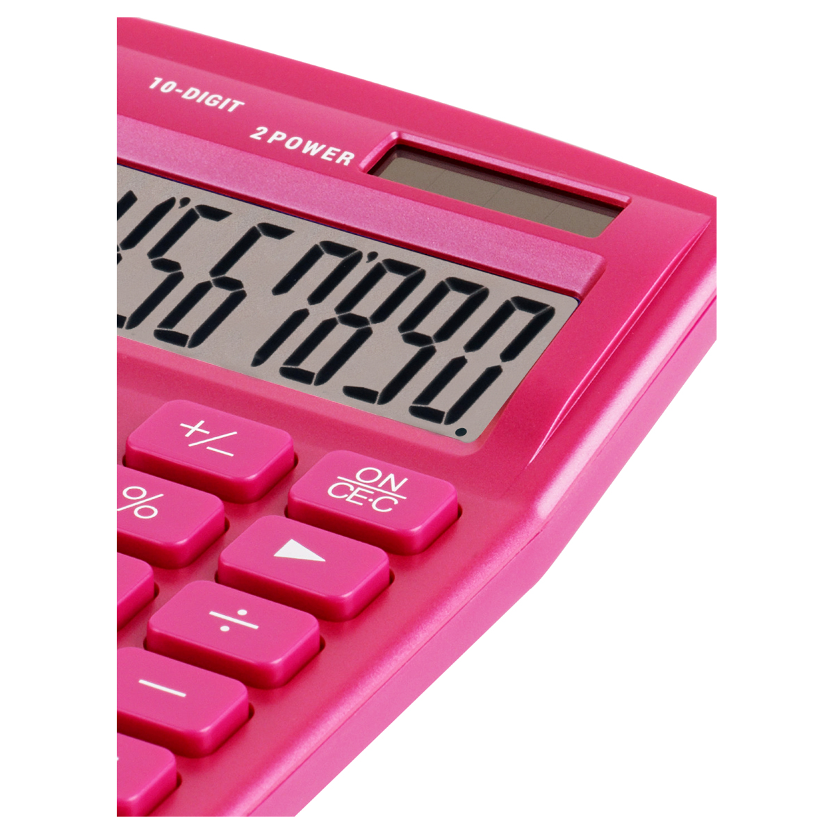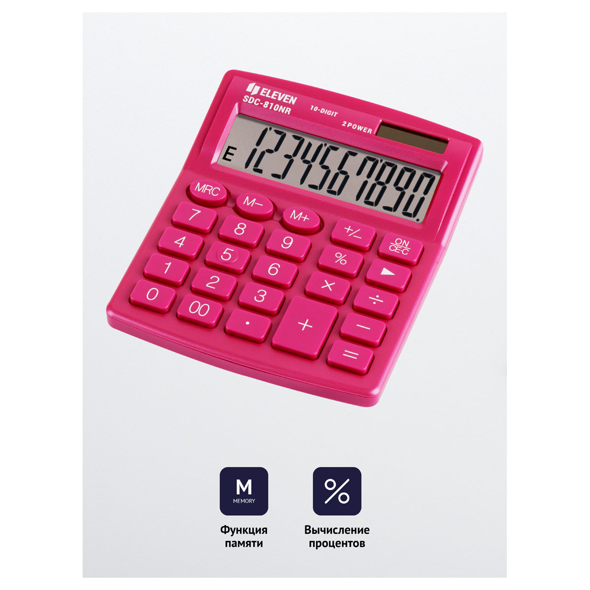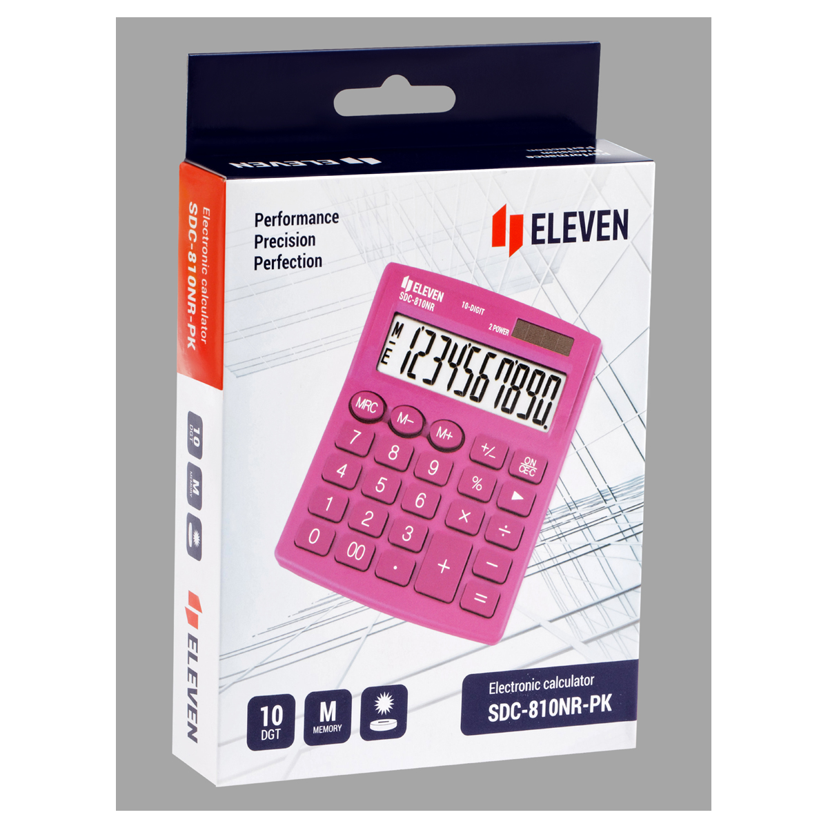 10-ти разрядный настольный калькулятор Eleven SDC-810NR-PK предназначен для выполнения арифметических операций. Оптимальный набор функций поможет автоматизировать расчёты: функция смены знака, коррекция последнего введенного значения. Двойное питание (солнечная батарея + батарея GP189(LR54)) и автоматическое отключение увеличивают срок службы. Размер калькулятора – 102*124*25 мм, вес – 94 г, цвет – розовый. Упакован в картонную коробку. Гарантия 5 лет. • Разрядность: 10; • Тип питания – двойное (солнечная батарея/батарейка GP189(LR54)); • Клавиша «00»;