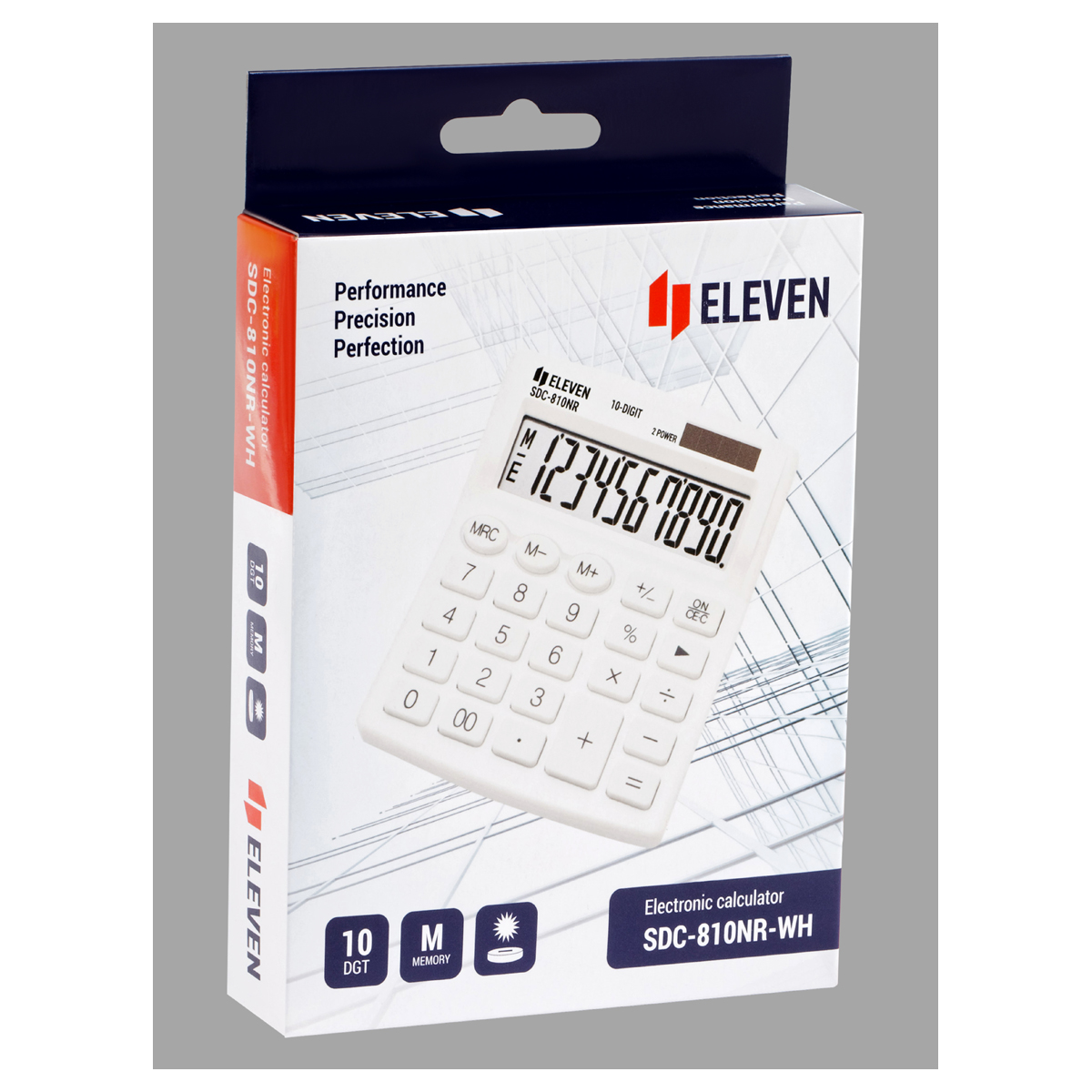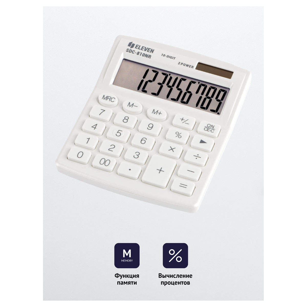 10-ти разрядный настольный калькулятор Eleven SDC-810NR- WH предназначен для выполнения арифметических операций. Оптимальный набор функций поможет автоматизировать расчёты: функция смены знака, коррекция последнего введенного значения. Двойное питание (солнечная батарея + батарея GP189(LR54)) и автоматическое отключение увеличивают срок службы. Размер калькулятора – 102*124*25 мм, вес – 94 г, цвет – белый. Упакован в картонную коробку. Гарантия 5 лет. • Разрядность: 10; • Тип питания – двойное (солнечная батарея/батарейка GP189(LR54)); • Клавиша «00»;