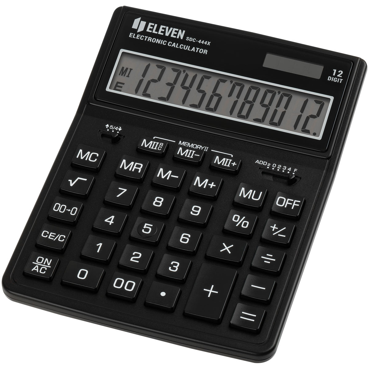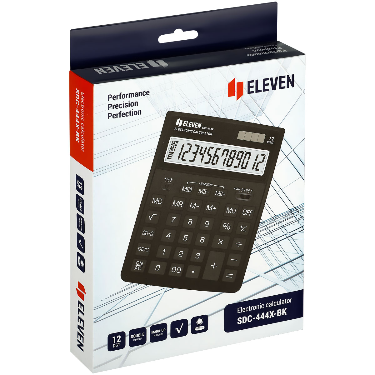 12-ти разрядный настольный калькулятор Eleven SDC-444X-BK предназначен для выполнения арифметических операций. Оптимальный набор функций поможет автоматизировать расчёты: вычисление квадратного корня, коррекция последнего введенного значения, кнопка «00», двойная память, расчёт наценки, смена знака. Двойное питание (солнечная батарея + батарея LR44) и автоматическое отключение увеличивают срок службы. Размер калькулятора – 155*204*33 мм, вес – 230 г, цвет – чёрный. Упакован в картонную коробку. Гарантия 5 лет.