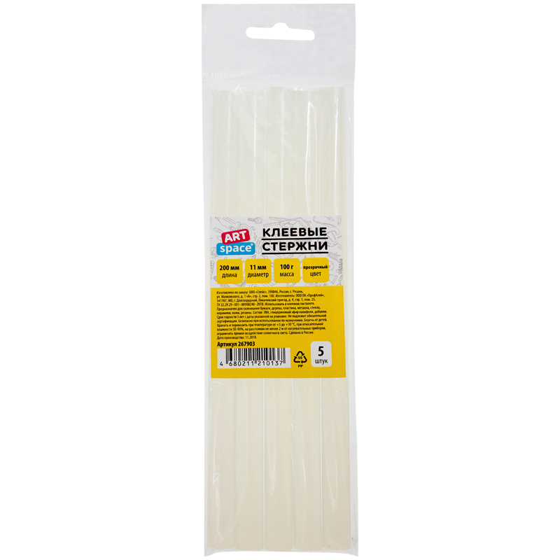 Клеевые стержни ArtSpace, диаметр 11мм, длина 200мм, прозрачные, набор 5шт., европодвес, 267903