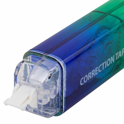Дизайн корпуса представлен в 3 сочных градиентных цветах ассорти: розово-голубом, сиренево-оранжевом, сине-зеленом. Подача ленты доступна с обеих сторон корпуса. Общая длина корректирующей ленты – 10 м, ширина – 5 мм.