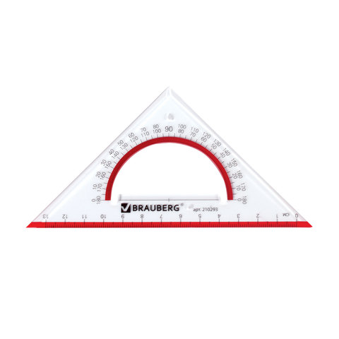 Прозрачный треугольник BRAUBERG с транспортиром предназначен для чертёжных и измерительных работ. Изготовлен из прочного прозрачного пластика толщиной 2 мм. Длина шкалы - 13 см, угол - 45°, транспортир - 180°. обладает четкой разметкой, что делает его удобным в использовании. Упакован в блистер с европодвесом.