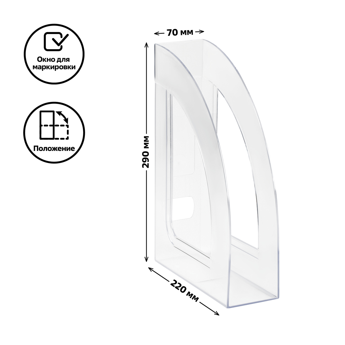 Лоток вертикальный для бумаг "СТАММ" серии "Респект" предназначен для хранения и систематизации бумажной продукции формата А4. Возможность установки в 2-х положениях - вертикальном и горизонтальном. Классический дизайн. Легкий, прочный, устойчивый корпус. На торцевой части есть отверстие для удобной переноски. Конструкция лотка имеет окно для маркировки, предусматривающее возможность смены этикеток. Изготовлен из качественного пластика. Цвет лотка - прозрачный. Изделие высотой 290мм, глубиной 220мм, шириной 70мм вмещает до 550 листов.