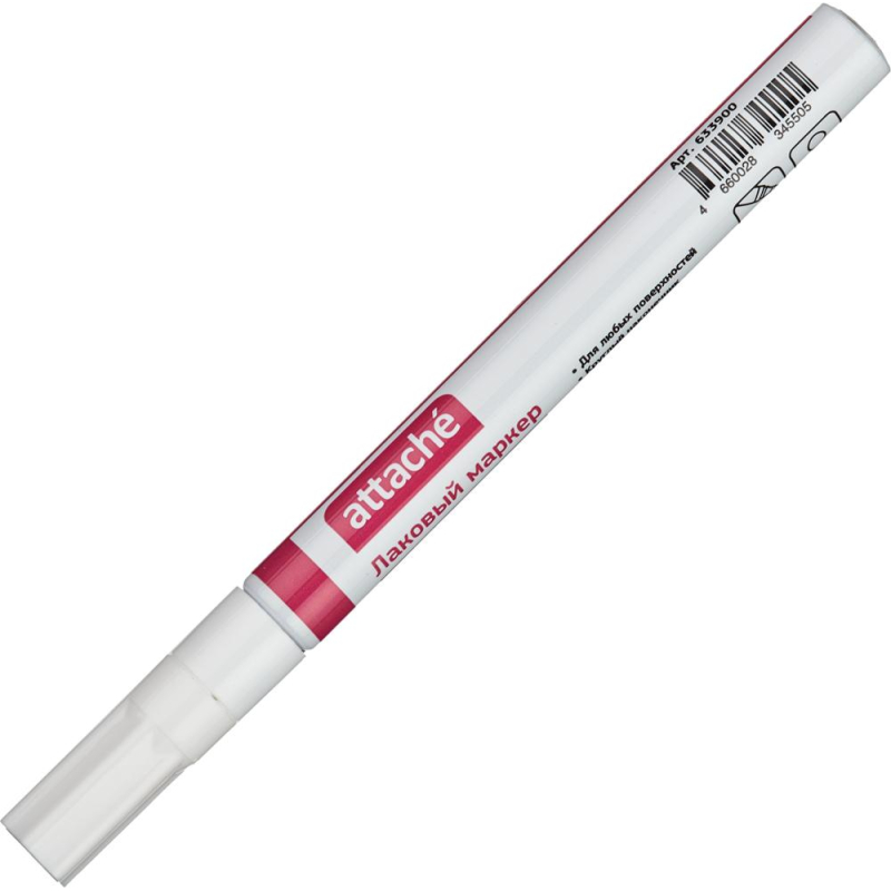 Маркер промышленный лаковый Attache, цвет чернил - белый, дает толщину линии письма 2 мм. Количество краски - 4 г. Предназначен для непрозрачной маркировки практически всех материалов, например, стекла, пластика, дерева или металла. Особенно подходит для темных и прозрачных материалов. Чернила маркера с лакирующим эффектом. Водостойкий, быстро сохнет. Поток чернил регулируется клапаном. Алюминиевый корпус. Толщина линии - 2мм. Наконечник изготовлен из Японского качественного материала.Инструкция по применению маркера:1. Перед использованием хорошенько встряхнуть с закрытым колпачком.2. Снимите колпачок, прижмите наконечник к поверхности, надавите и удерживайте, пока не проступит краска.3. Применять после того как убедитесь, что вытекает исходный цвет. Предостережения: плотно закрывайте колпачок после применения, держать маркер вдали от огня, прямые солнечные лучи вызывают обесцвечивание.