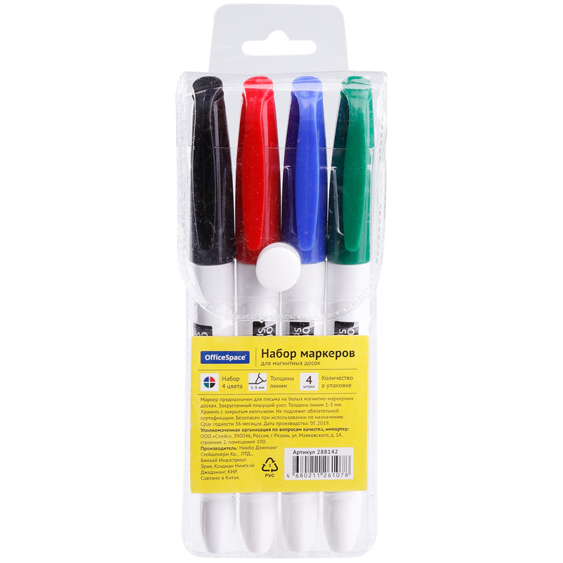 Набор маркеров OfficeSpace предназначен для письма на магнитно-маркерных досках. Толщина линии: 1-3 мм. Набор упакован в ПВХ чехол с европодвесом размерами 163*60*15 мм. Длина письма: 350 м. Закруглённый пишущий узел. В наборе 4 цвета: красный, синий, зеленый, чёрный. Чернила легко стираются сухой губкой для досок. Хранить с закрытым колпачком.