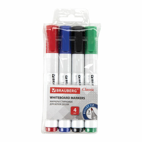 Маркеры стираемые для белой доски НАБОР 4 ЦВЕТА, BRAUBERG "CLASSIC", 3 мм, с клипом, 152117