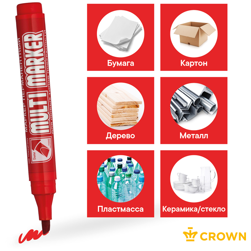 Перманентный маркер Crown "Multi Marker Chisel" - универсальное решение для маркировки на всех типах поверхностей: металл, дерево, резина, бетон/камень/кирпич, стекло, пленка, картон и др.