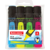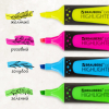 В наборе четыре неоновых цвета: желтый, зеленый, голубой и розовый. Плоская форма корпуса, диаметр которого 25 мм. Резиновые вставки обеспечивают эргономичную зону захвата, предотвращая скольжение в процессе использования. Скошенный наконечник имеет толщину линии письма от 1 до 5 мм, что обеспечивает удобство при работе с текстом, напечатанным мелким шрифтом, или таблицами. Благодаря особой водной основе чернил текстовыделители не высыхают без колпачка в течение 8 часов. Текстовыделители обладают экономным расходом чернил, при этом длина линии письма достигает 300 метров. Чернила быстро впитываются, предотвращая размазывание. Цвет корпуса соответствует цвету чернил.