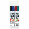 В наборе 4 цвета: зеленый, красный, синий и черный. Имеют круглую форму корпуса, цветной колпачок, соответствующий цвету чернил. Чернила на спиртовой основе быстро высыхают на поверхности доски, не протекают при перепаде давления, имеют высокую светостойкость и легко стираются сухой губкой без остатка. Закругленный пишущий узел. Ширина линии – 2,5 мм. Плотный колпачок с клипом предотвращает высыхание. Нетоксичные. Не содержат ксилол, толуол. Хранить горизонтально.