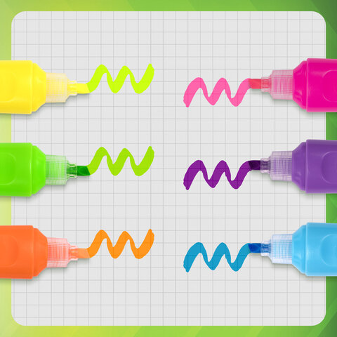 6 неоновых цветов: желтый, зеленый, оранжевый, розовый, фиолетовый и голубой, – помогают ярко выделить важное в тексте. Колпачок и корпус соответствуют цвету чернил.