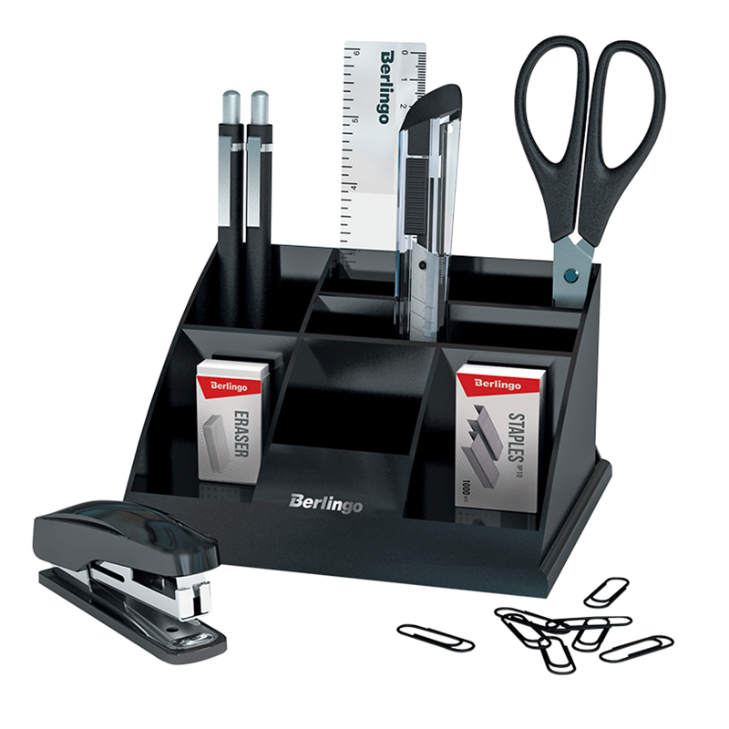 Настольный органайзер Berlingo Western – это лаконичный дизайн и функциональность. Корпус выполнен из высококачественного чёрного пластика. В состав Berlingo Western входят: линейка, офисный нож, шариковая автоматическая ручка, механический карандаш, ластик, ножницы, степлер, скобы, скрепки. • Материал: пластик; • Цвет: чёрный; • Количество секций: 7; • Количество предметов: 9.