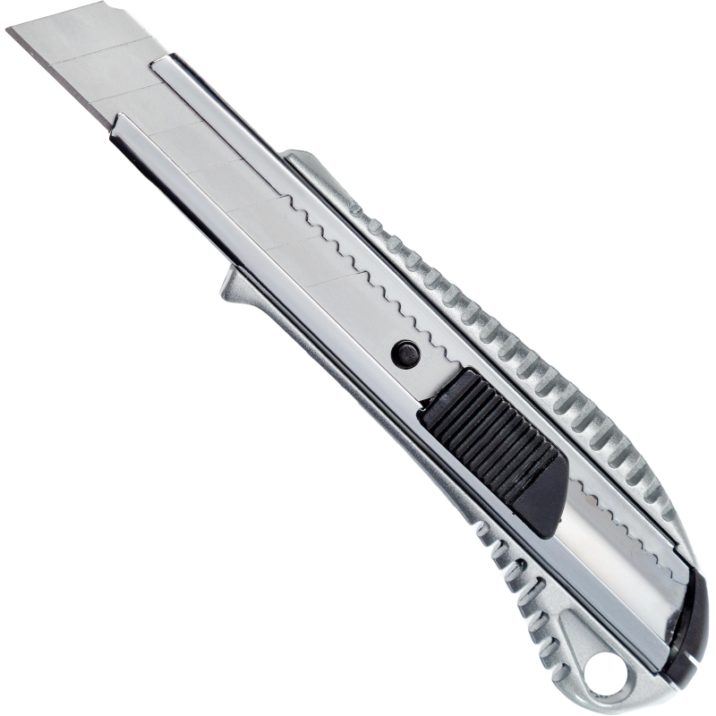 Нож универсальный Attache Selection с сегментированным отламывающимся лезвием. Подходит для резки бумаги, пленки, ленты стрейч, кожи, для складских работ, а также для проведения ремонтных работ, не требующих приложения больших усилий. Эргономичный, надежный корпус с пластиковыми вставками с рефлением. Металлическая направляющая из нержавеющей стали обеспечивает надежную фиксацию лезвия в момент использования. Особенности изделия:— Корпус выполнен из цинкового сплава — устойчив к коррозии— Сменное сегментированное лезвие из стали — Система автоматической фиксации лезвия (Auto-lock) позволяет отрегулировать длину лезвия и закрепить его положениеХарактеристики изделия:— Длина ножа 155 мм— Ширина лезвия 18,0 мм— Толщина лезвия 0,5 мм— Количество рабочих сегментов 8 шт.Схема замены лезвия:1.Сдвинуть к корпусу фиксатор держателя2. Извлечь затупившееся лезвие3.Перевернуть его другой стороной или заменить на новое4.Установить в держатель и отпустить фиксаторМеры предосторожности: — При работе с лезвиями используйте средства защиты — Не утилизируйте лезвия с бытовыми отходами — Хранить в недоступном для детей месте