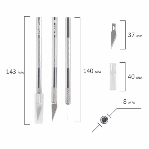 Нож макетный (скальпель) STAFF, 11 лезвий в комплекте, металлический корпус, блистер, 238257