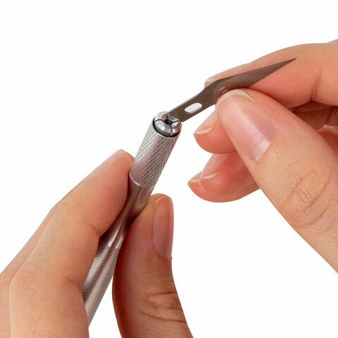 Ультратонкое металлическое лезвие с заостренным кончиком закрывается колпачком по окончании работы. Ширина лезвия составляет 8 мм. Поставляется в блистере с европодвесом. 10 запасных лезвий в комплекте.