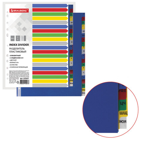 Разделитель пластиковый BRAUBERG А4+, 20 листов, алфавитный А-Я, оглавление, Цветной, РОССИЯ, 225627