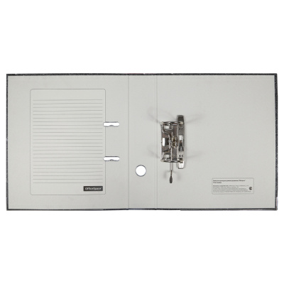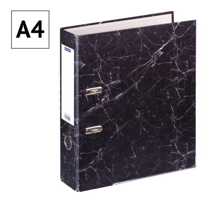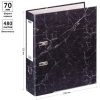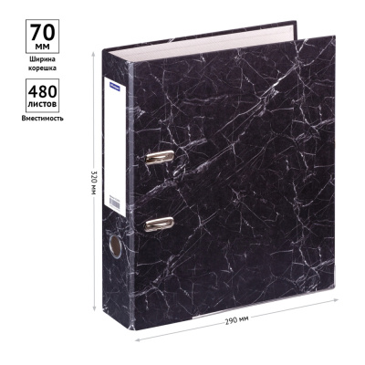 Папка-регистратор для хранения документов, металлический арочный механизм, покрытие офсетная бумага. Размер составляет 280*310*70мм. На корешке этикетка для записей. Формат А4+. Ширина корешка 70 мм. Цвет «чёрный мрамор». Нижние грани укреплены металлическим кантом.