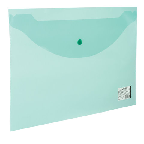 Папка-конверт с кнопкой STAFF, А4, 340х240 мм, прозрачная, зеленая, до 100 листов, 0,12 мм, 225171