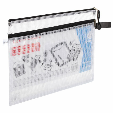 Папка-конверт на молнии BRAUBERG "Solid", А4, 335х243 мм, ПВХ, сетка, 0,3 мм, 2 отделения, прозрачная, 223889