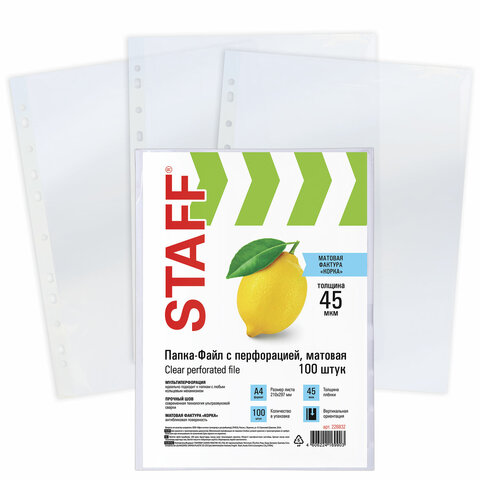Перфорированные папки-файлы STAFF — оптимальное решение для различных государственных учреждений, офисов коммерческих предприятий. Предназначены для хранения и защиты печатных документов. Перфопапки формата А4 с вертикальным размещением содержат универсальную перфорацию, а также имеют матовую поверхность и прочные швы. Толщина пленки - 45 мкм, что подходит для хранения документов - до 50 листов в 1 папке-файле.