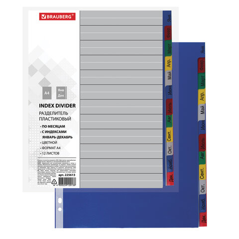 Разделитель пластиковый BRAUBERG, А4, 12 листов, Январь-Декабрь, оглавление, цветной, Россия, 225613