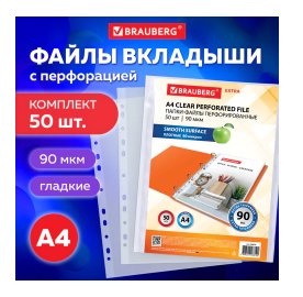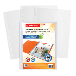 Папки-файлы перфорированные А4 BRAUBERG "EXTRA 900", КОМПЛЕКТ 50 шт., гладкие, ПЛОТНЫЕ, 90 мкм, 229670