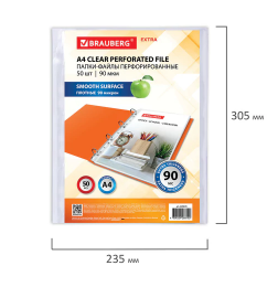 Перфорированные папки-файлы BRAUBERG "EXTRA 900" предназначены для хранения документов в папке с любым кольцевым механизмом или скоросшивателем. Перфопапки формата А4 с вертикальным размещением содержат универсальную перфорацию, а также имеют гладкую поверхность и прочные швы. Файлы являются незаменимым атрибутом в офисе, позволяют систематизировать документы и обеспечивают их сохранность на долгое время. Изготовлены из прочной пленки толщиной 90 мкм. В комплект входит 50 перфопапок.