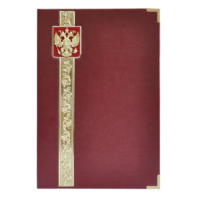 Адресная папка формата А4. Папка выполнена из балакрона (ПВХ с имитацией кожи). На обложке объемное металлизированное изображение — орнамент и герб России. Уголки отделаны металлическими вставками. Внутри папки — отделка из бумаги на меловке плотностью 240 г. и ленточка для фиксации. В комплект входит вкладыш для текста поздравления, дарственной надписи. Памятный аксессуар для празднования Дня Победы 9 Мая и других торжественных мероприятий.