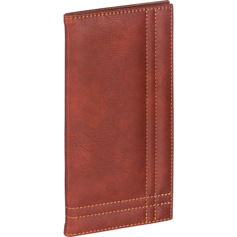 Папка для счета из искусственной кожи с декоративной отстрочкой для использования в барах, ресторанах, кафе. Цвет: коричневый. На обложку можно нанести логотип (тиснение) методом вдавливания. Формат — 110×230 мм. Страна производства: Россия.