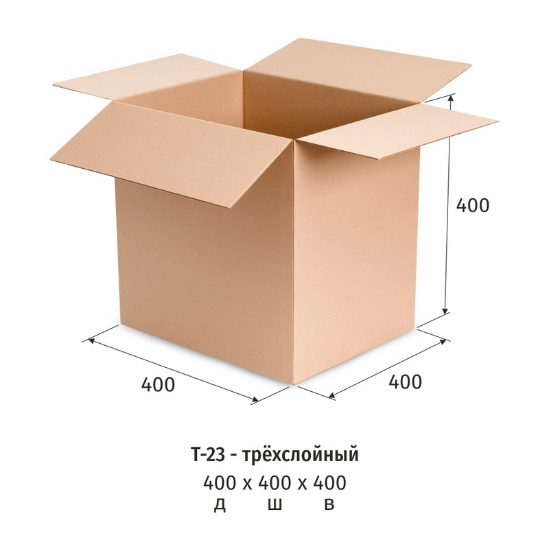 Короб картонный 400×400×400 мм Т-23 10 штук в упаковке. Универсальный четырехклапанный короб для упаковывания. Предназначен для упаковывания, хранения и транспортировки различных грузов с защитой от ударов и влаги. Подходит как для упаковки бытовой химии, так и пищевых продуктов. В пустом виде картонный гофрокороб легко и удобно складывается. Выполнен из трехслойного гофрокартона марки Т-23 бурого цвета. Гофрокартон имеет профиль В. Размеры (ДxШxВ) — 400×400×400 мм (64 литра).