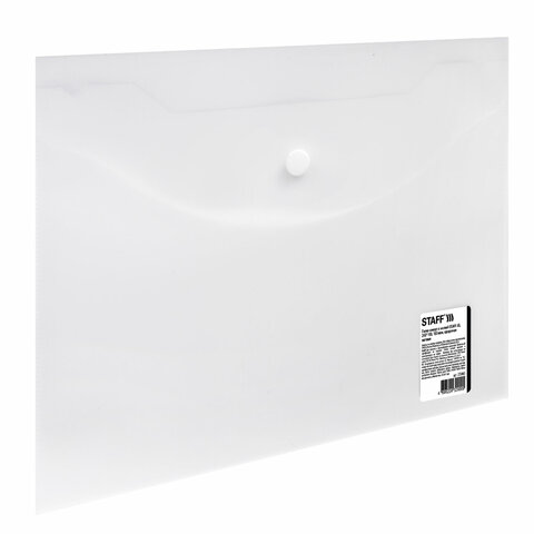 Папка-конверт с кнопкой STAFF - универсальная модель для хранения, транспортировки и защиты документов от повреждений природного и механического характера. Станет незаменимым помощником для школьников, студентов, офисных работников и творческих людей. Папка-конверт с гладкой фактурой формата А5 изготовлена из плотного матового полупрозрачного пластика толщиной 150 мкм. Закрывается на защелку-кнопку, что способствует удобству при частом использовании и обеспечивает быстрый доступ к содержимому. Папка способна вместить до 100 листов стандартной плотности.