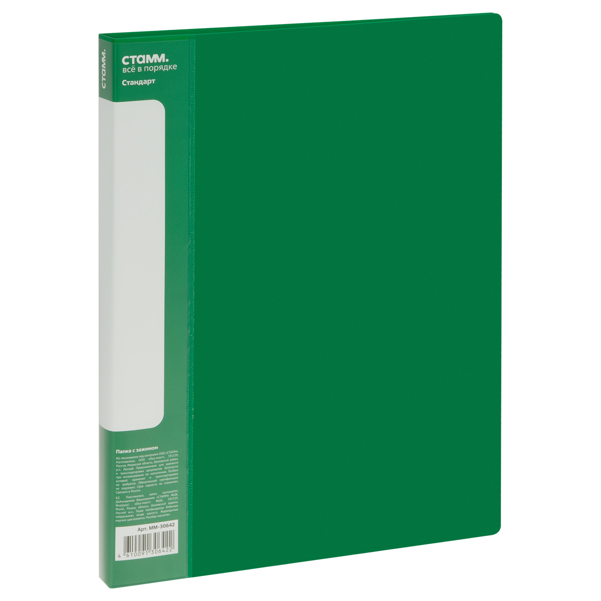 Папка с боковым зажимом СТАММ "Стандарт" А4, 17мм, 700мкм, пластик, зеленая, 355328