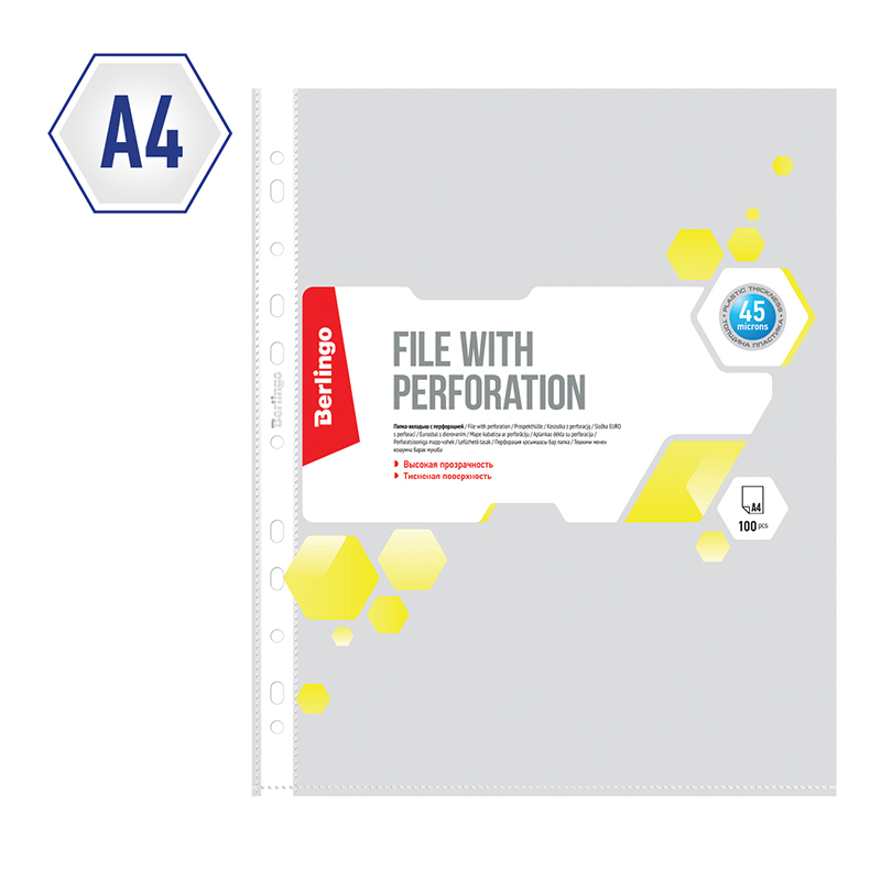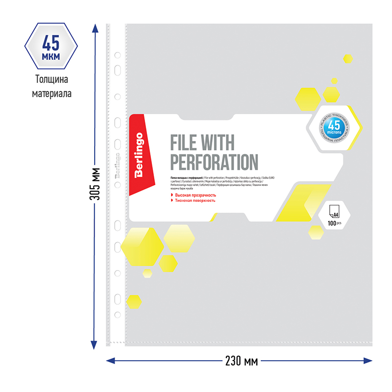 Папка-вкладыш с универсальной перфорацией Berlingo формата А4 отлично подойдёт для хранения неперфорированных документов. Вмещает до 60 листов. Упаковка в пакет по 100 штук. Папка-вкладыш изготовлена из пластика толщиной 45 мкм. Имеет тисненую поверхность и высокую прозрачность. Выполнена в размере 305*235 мм. На боковой ленте присутствует логотип бренда. Ориентация папки – вертикальная.