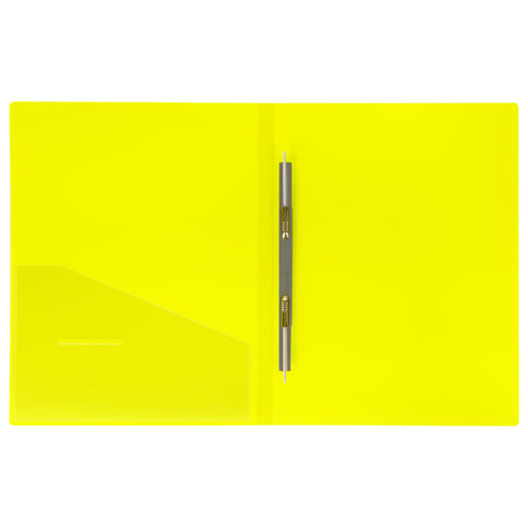 Изготовлена из высококачественного пластика желтого неонового цвета толщиной 0,7 мм с фактурой "песок". Обеспечивает хранение до 100 листов формата А4. Металлический скоросшиватель с пружинным механизмом обеспечит надежную фиксацию документов. Кроме того, папка снабжена прозрачным внутренним карманом. Для идентификации имеется бумажный корешок. Поставляется в индивидуальной упаковке.