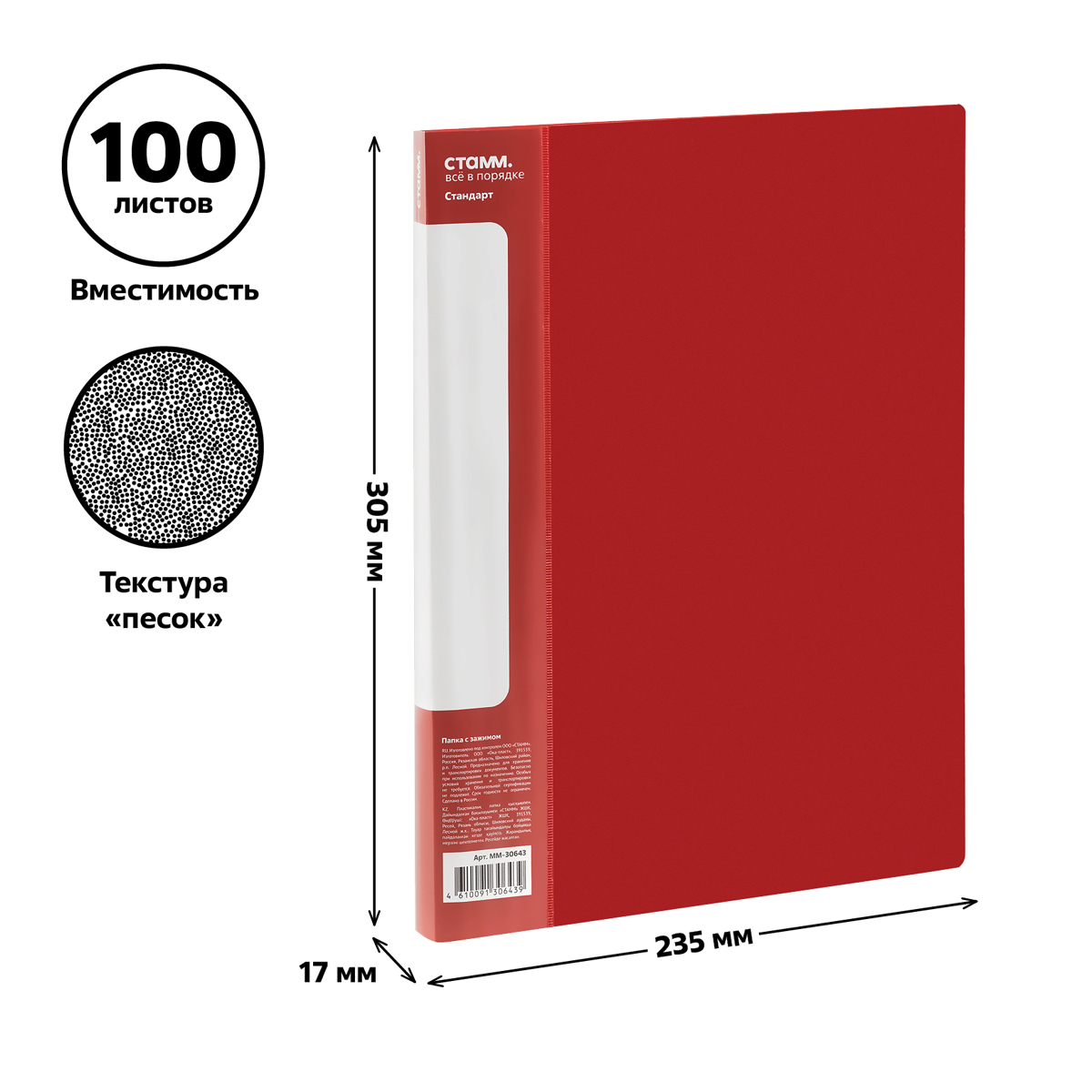 Папка с 2 зажимами «СТАММ» серии «Стандарт» предназначена для хранения бумаг формата А4. Цвет папки – красный. Папка изготовлена из качественного полипропилена толщиной 700 мкм с текстурой «песок». Тип скрепления – зажим. Размер изделия составляет 310*235 мм. Ширина корешка – 17 мм позволяет вмещать в папку до 100 листов. Боковой и верхний зажимы надёжно фиксируют документы. На корешке папки имеется карман. Папка упакована в индивидуальный пакет.