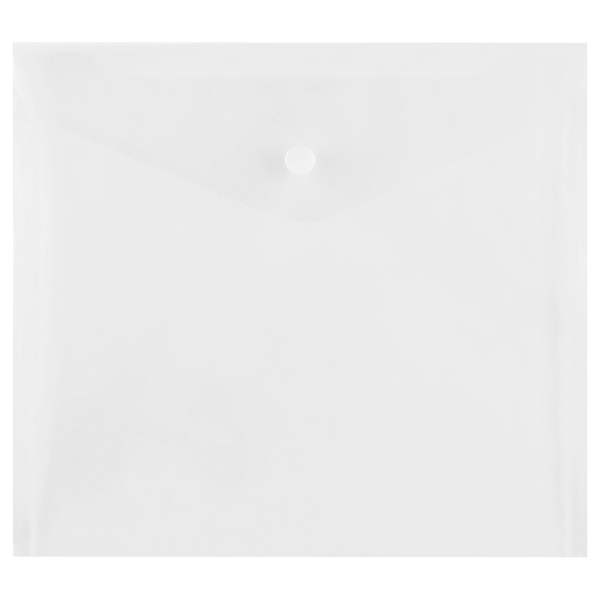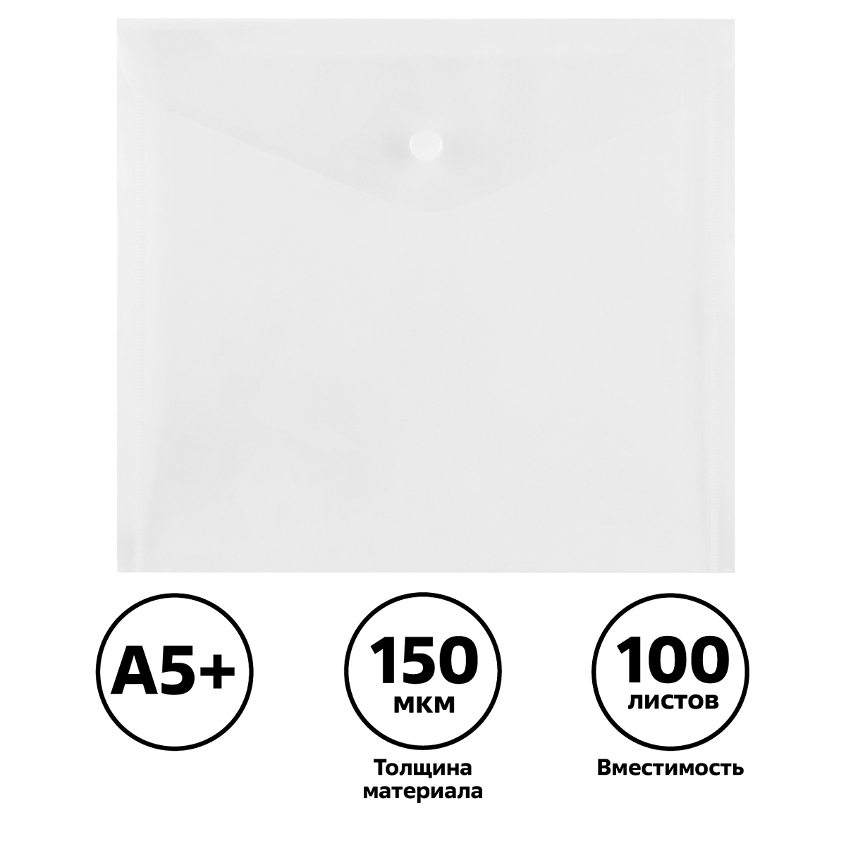 Папка-конверт на кнопке «СТАММ» формата А5+ надёжно защищает документы от влаги и пыли. Горизонтальная папка вмещает до 100 листов. Цвет папки – прозрачный бесцветный. Папка изготовлена из качественного полипропилена плотностью 150 мкм с глянцевой текстурой. Размер папки составляет 240*215 мм. Изделие плотно закрывается клапаном с кнопкой.