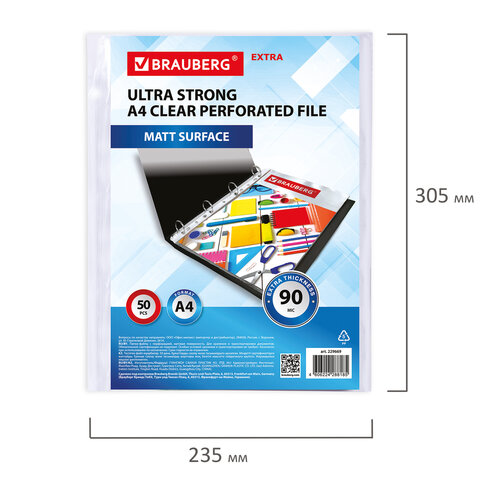 Папки-файлы перфорированные А4 BRAUBERG "EXTRA 900", КОМПЛЕКТ 50 шт., матовые, ПЛОТНЫЕ, 90 мкм, 229669